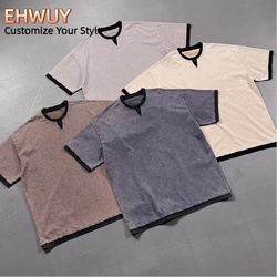 EHWUY Personalizado Vintage T-Shirt 250gsm Algodão Peso Pesado Batik Padrão V-Neck Solto Fit Técnica Lavada Design Sólido